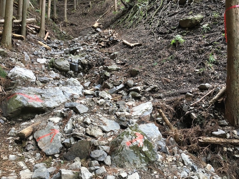台風か何かの影響で道が崩れたのか、石に矢印が書き込んであるので、