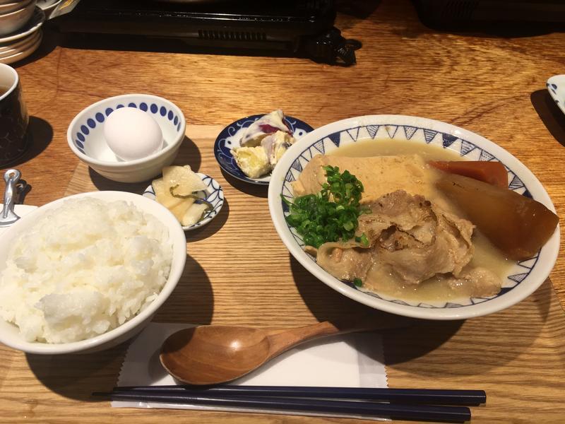 野菜に豚肉に具材の主張が強い!大根に人参は細かくカットされていなくて、ごろっとしたひとかたまりで入っています。豚肉は炙ってあるし生姜焼きか?と思うくらいの存在感。(しょうが焼き豚汁なるメニューもある)豆腐も、ひと塊りでドーンと入っています。とん汁を食べるというより具材をしっかり食べるという感じです。
